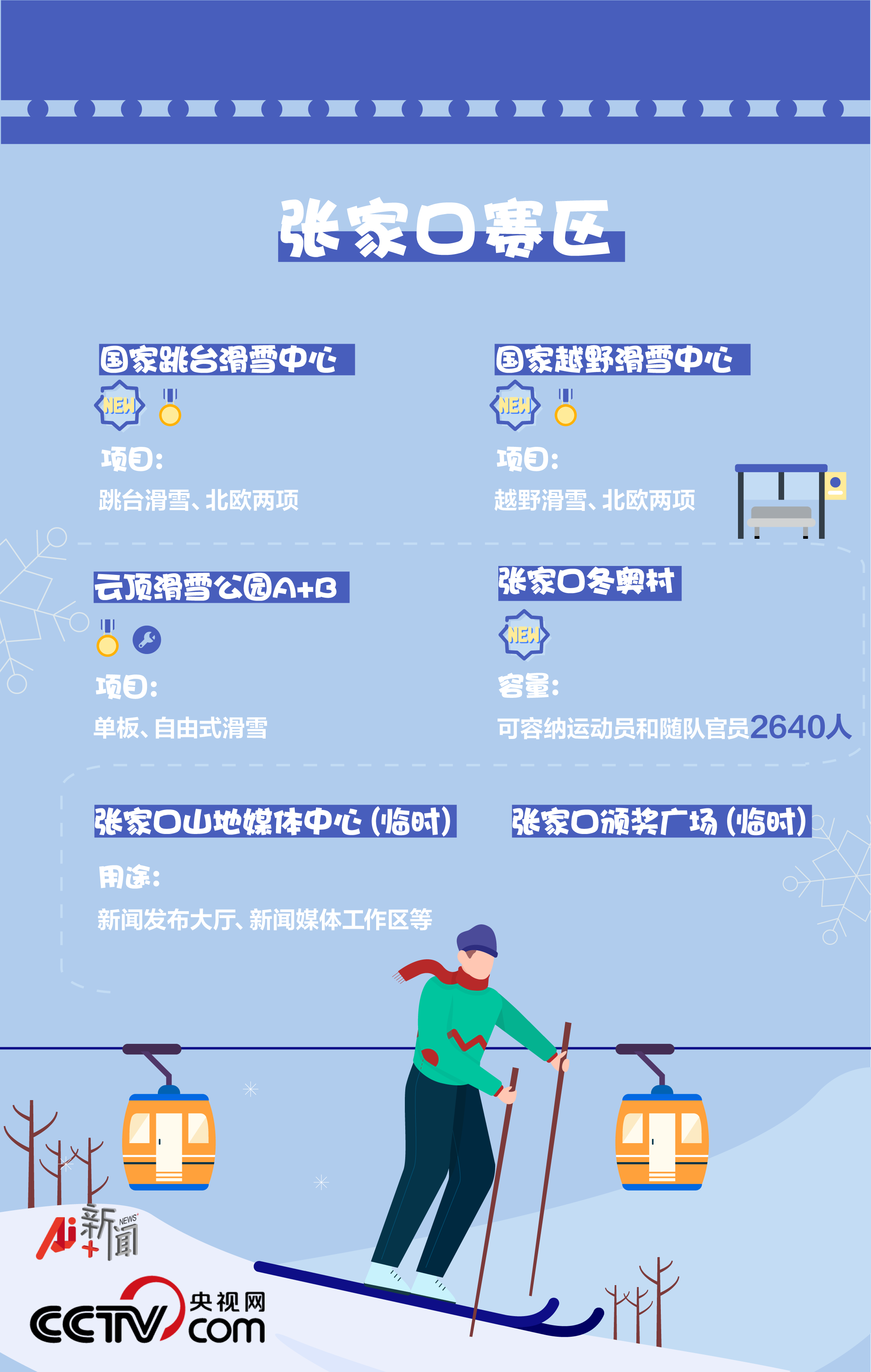 張家口賽區(qū)位于河北省張家口市崇禮區(qū),共有7個競賽和非競賽場館,其中4個為新建場館、1個為現(xiàn)有場館、2個為臨時場館,將進(jìn)行2個大項(xiàng)(滑雪、冬季兩項(xiàng))、6個分項(xiàng)(冬季兩項(xiàng)、越野滑雪、跳臺滑雪、北歐兩項(xiàng)、自由式滑雪和單板滑雪)、51個小項(xiàng)的比賽。