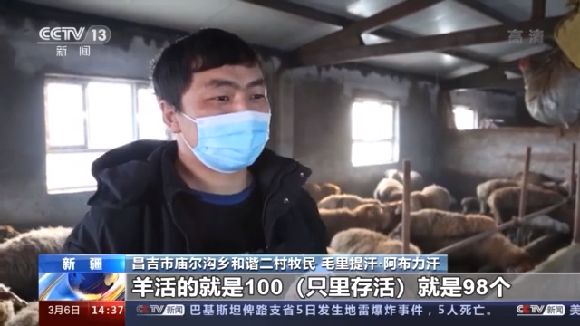 昌吉市廟爾溝鄉(xiāng)和諧二村牧民 毛里提汗·阿布力汗:外面天冷的時(shí)候,我們把羊娃抱過來(在圈里過夜)。我們這個(gè)羊活的就是100(只里存活)就是98個(gè)。