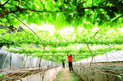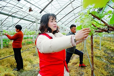 農(nóng)戶在河北省巨鹿縣西郭城鎮(zhèn)南鹽池村果蔬大棚管護(hù)葡萄。胡良川攝/光明圖片