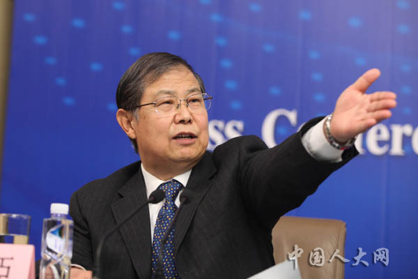 3月11日上午,十二屆全國人大二次會議在梅地亞中心舉行記者會,中國人民銀行行長周小川等五位嘉賓就“金融改革與發展”的相關問題回答中外記者的提問。圖為十二屆全國人大二次會議新聞中心副主任祝壽臣主持。羅榮 攝