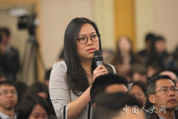 3月11日上午,十二屆全國人大二次會議在梅地亞中心舉行記者會,中國人民銀行行長周小川等五位嘉賓就“金融改革與發展”的相關問題回答中外記者的提問。圖為中央人民廣播電臺、央廣網記者提問。羅榮 攝