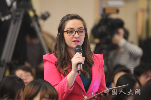 3月11日上午,十二屆全國人大二次會議在梅地亞中心舉行記者會,中國人民銀行行長周小川等五位嘉賓就“金融改革與發展”的相關問題回答中外記者的提問。圖為澳大利亞環球凱歌傳媒集團記者提問。羅榮 攝