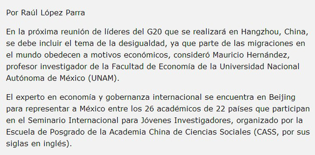 二十國集團杭州峰會開幕在即,墨西哥作為 G20的重要成員之一,國內的專家學者對于本次會議一直保持著高度的關注,我對本次G20杭州峰會充滿期待,希望本次峰會能夠就減少貧富差距、與貧困作斗爭的話題更多達成共識,積極地采取行動。