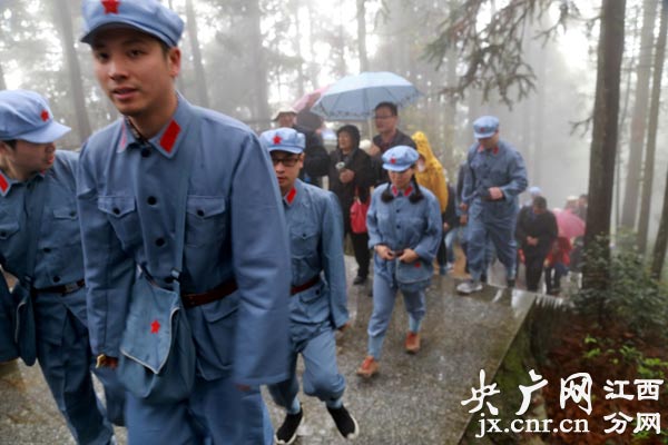 民警身著紅軍服,重走當年朱、毛紅軍挑糧小道,踏著當年紅軍的足跡,追憶紅色歷史的痕跡。