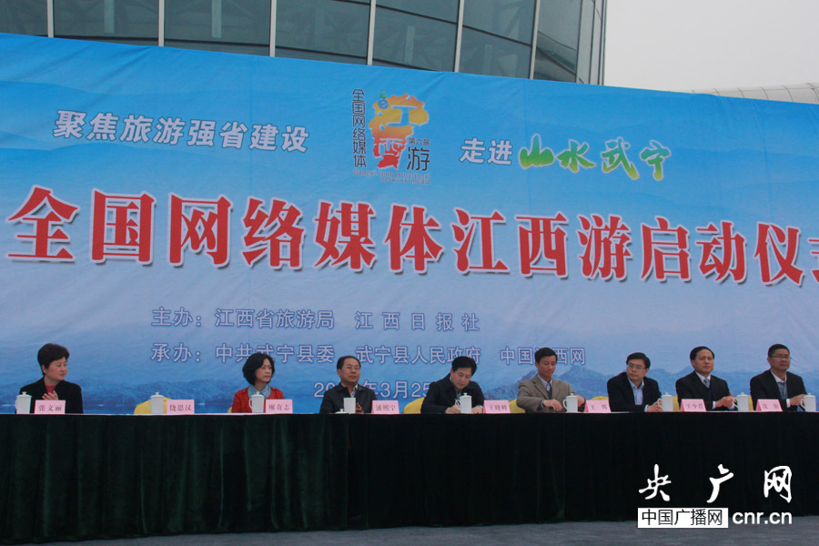 央廣網3月25日消息(記者劉千里)3月25日上午,“聚焦旅游強省建設——山水武寧·第六屆全國網絡媒體江西游”大型采風活動在江西九江武寧縣啟動。江西省旅游局局長王曉峰,江西日報社社長王暉出席啟動儀式并講話。九江市委常委、市委宣傳部部長潘熙寧宣布第六屆全國網絡媒體江西游正式啟動,并向媒體代表授旗。九江市副市長廖奇志在啟動儀式上講話。武寧縣委書記沈陽致歡迎辭。