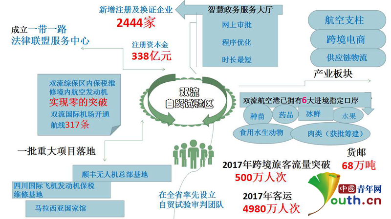中國(guó)青年網(wǎng)成都6月7日電(劉洪材 記者 李建軍 實(shí)習(xí)生 張徐)在成都雙流自貿(mào)試驗(yàn)區(qū)34.01平方公里的“試驗(yàn)田”上有一張成績(jī)單:全面完成2017年87項(xiàng)改革試驗(yàn)任務(wù)、去年實(shí)現(xiàn)主營(yíng)業(yè)務(wù)收入1429億元、稅收81.4億元(含海關(guān)稅收)、自貿(mào)試驗(yàn)區(qū)智慧政務(wù)服務(wù)大廳開發(fā)運(yùn)營(yíng)、新增注冊(cè)及換證企業(yè)2444家、綜保區(qū)內(nèi)貨物流轉(zhuǎn)由9小時(shí)縮短至9分鐘、2017年實(shí)現(xiàn)旅客吞吐量4980萬(wàn),全國(guó)排名第四……