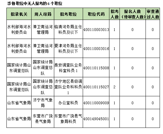涉魯職位仍有6席無人報考,分別類屬于水利部海河水利委員會、國家統計局山東調查總隊和山東省氣象局。“爆零”職位為臨清河務局主任科員及以下、夏津河務局主任科員及以下、泰安調查隊業務科室科員1、濟寧地區縣級調查隊業務科科員1、濟寧市氣象局辦公室科員、東營市廣饒縣氣象局科員。