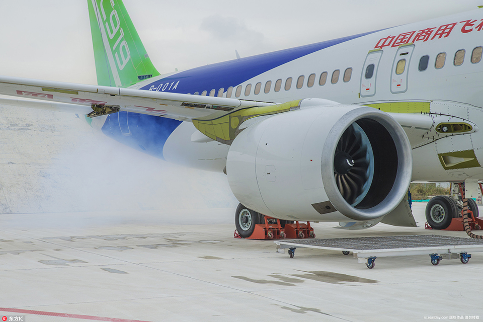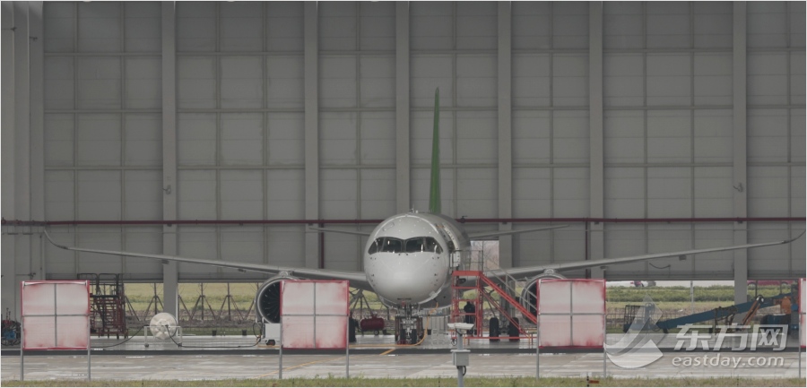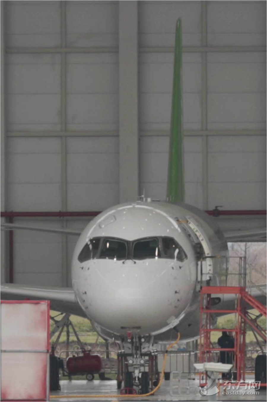 近日,為確保C919大型客機首飛成功,對C919設計結果、制造狀態、試飛和客服工程準備工作進行確認,中國商用飛機有限責任公司在上海組織召開了C919首飛技術評審會。評審委員會一致同意通過C919首飛技術評審。同時,建議在完成電磁兼容等試驗及滑行試驗驗證后可提請首飛放飛評審,這標志著C919向著首飛目標又邁出了堅實的一步。圖為:中國國產大飛機c919正在上海浦東機場機庫中調試。