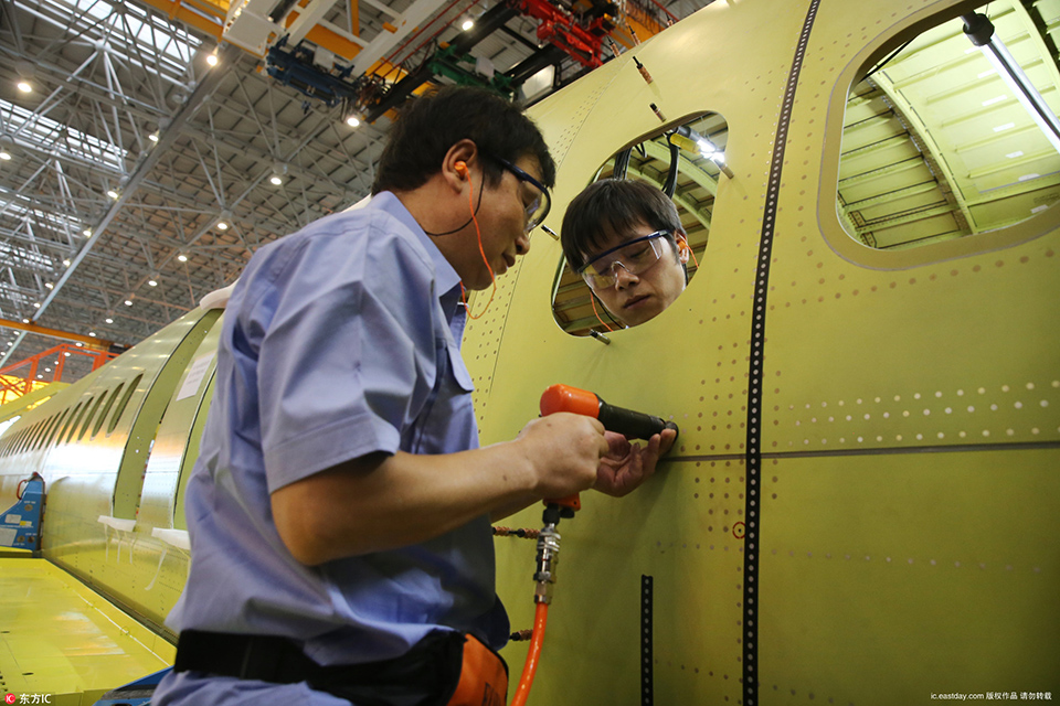 2014年9月19日,上海,中國商飛公司研制的C919國產大型客機前機身與中機身的對合標志著C919拉開了總裝序幕。