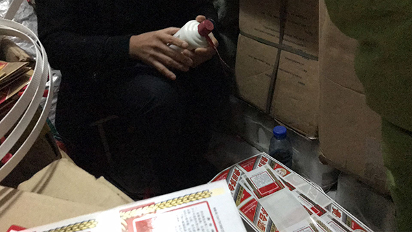 制假者在地下室里包裝假茅臺酒。