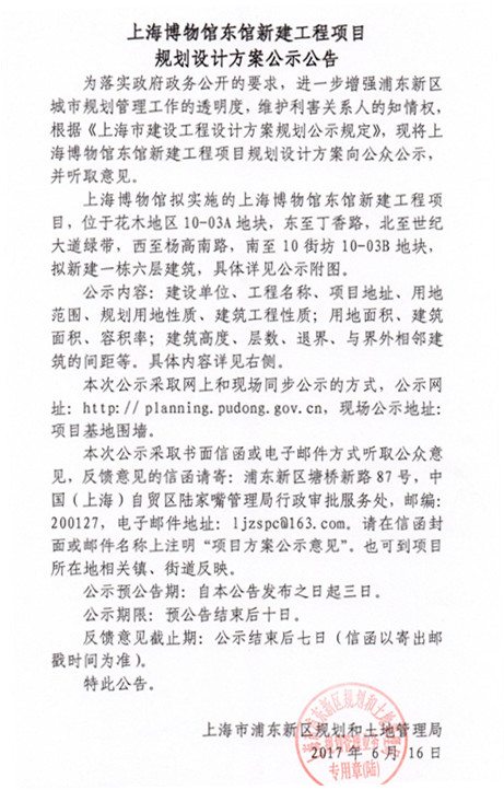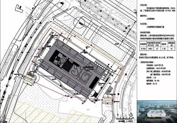 根據公式信息,上海博物館東館選址花木地塊,東至丁香路,北至世紀大道綠帶,西至楊高南路,將會是一棟六層建筑。用地面積46001平方米,總建筑面積108737平方米,其中地上面積84235平方米,地下面積24502平方米,容積率1.83、建筑高度45米。