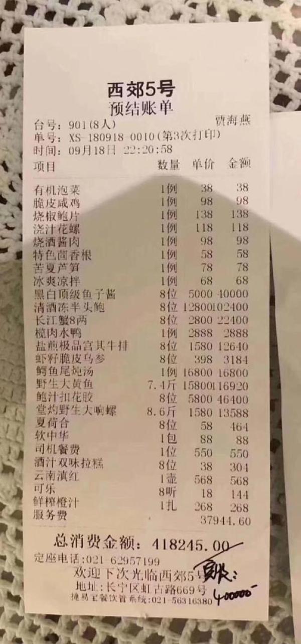 9月19日,一份“天價(jià)賬單”在網(wǎng)上引發(fā)關(guān)注。網(wǎng)傳“天價(jià)賬單”照片顯示,其出自一家名為“西郊5號”的飯店,位于上海虹古路669號,就餐時(shí)間為9月18晚,8人點(diǎn)了20道菜,最后算上服務(wù)費(fèi),共花費(fèi)418245元,實(shí)付40萬元。