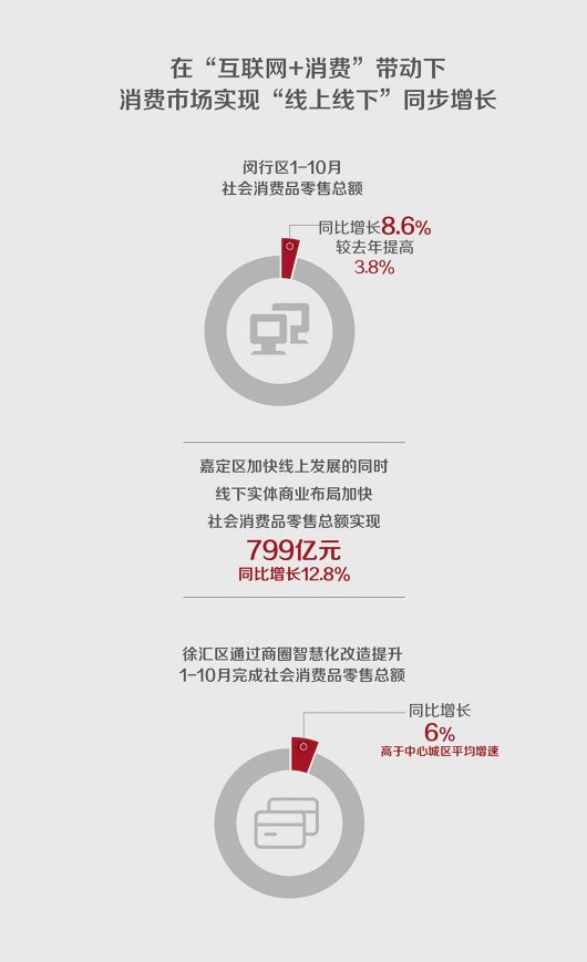 在“互聯網+消費”帶動下,消費市場實現“線上線下”同步增長。閔行區1-10月社會消費品零售總額同比增長8.6%,較去年提高3.8個百分點,日用家電在蘇寧云商的帶動下零售額增長近2倍;嘉定區加快線上發展的同時,線下實體商業布局加快,社會消費品零售總額實現799億元,同比增長12.8%,“嘉境通”實現跨境電子商務交易額9878.9萬元;徐匯區通過商圈智慧化改造提升,1-10月完成社會消費品零售總額同比增長6%,高于中心城區平均增速。