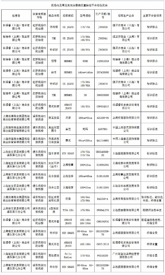 虹橋機場T2航站樓內的杜福睿(上海)商業有限公司銷售的標稱由杜福睿北京商業咨詢有限公司生產(供貨)的“ARMANI JEANS”牌男式外套(型號規格:185/100A;生產日期或批號:C6N713N15)也被查出纖維含量名不副實的問題。