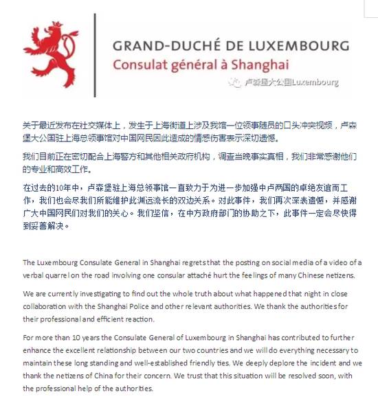 關(guān)于最近發(fā)布在社交媒體上,發(fā)生于上海街道上涉及我館一位領(lǐng)事隨員的口頭沖突視頻,盧森堡大公國(guó)駐上海總領(lǐng)事館對(duì)中國(guó)網(wǎng)民因此造成的情感傷害表示深切遺憾。