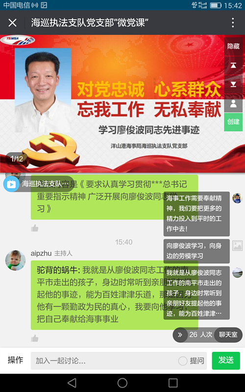 據悉,為切實提高黨員參加組織生活的有效性,今年以來,洋山港海事局海巡執法支隊黨支部以落實“兩學一做”學習教育常態化制度化為契機,針對支部有近一半的黨員分布在海事巡邏艇上翻班和偏遠島嶼站點值班,不方便參與集中學習的這一特殊情況,對傳統黨課進行大膽創新,充分利用微信等新興媒體傳播速度快、受眾范圍廣、便捷高效的優勢,率先在微信上開辟了掌心上的“微黨課”在線直播,支部書記作為主持人將上級指示精神以及近期學習內容以視頻或者圖文的形式“搬”上網絡,并在直播頁面內設置評論專區和互動專區。學習的同時,黨員可以在評論區里隨時與主持人進行交流探討,切實提高了黨員參加組織生活的有效性。