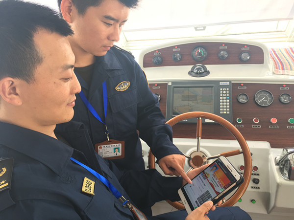 洋山港海事局海巡執法支隊黨支部黨員在巡邏艇上收聽“微黨課”