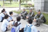 炎炎夏日,兩名軍人還全副武裝為同學(xué)們展示了負(fù)重裝備,熱得汗流浹背。有同學(xué)親身感受了負(fù)重裝備,只覺得寸步難行,可以想象背著負(fù)重裝備越野是多么地不易。 -