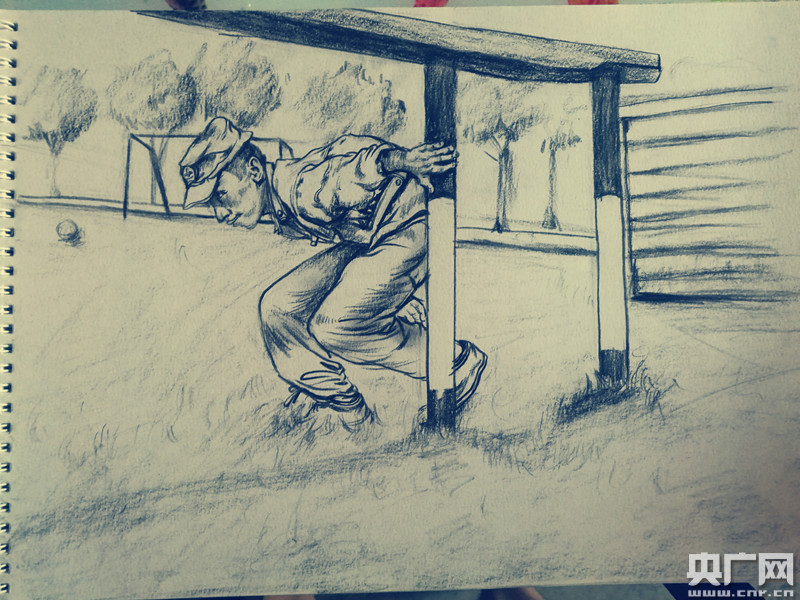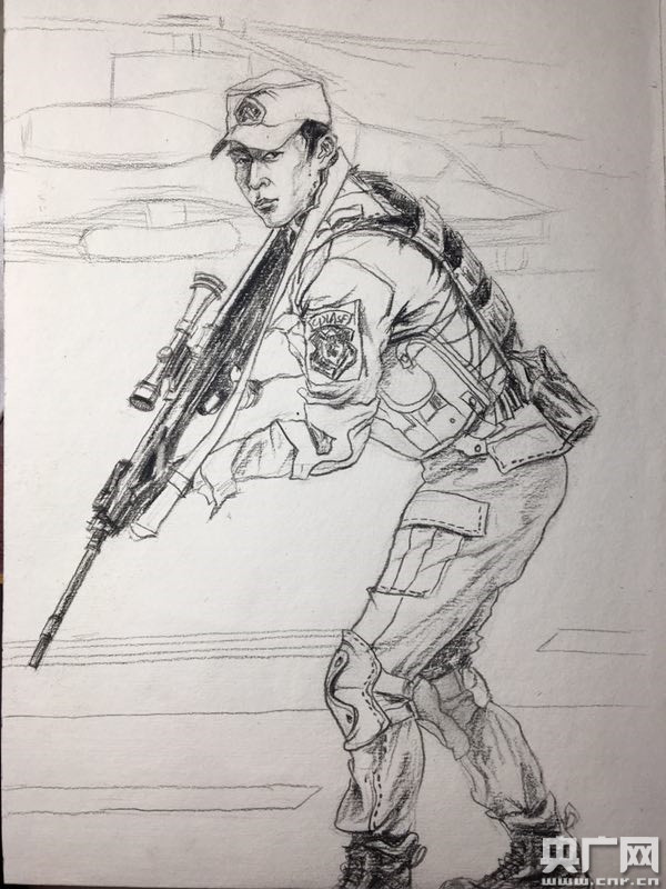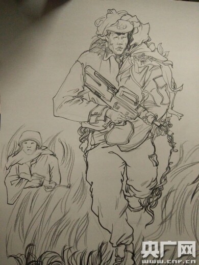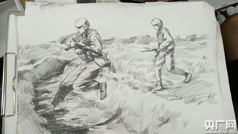 由于軍隊的特殊性,上海第二工業(yè)大學(xué)的同學(xué)們實地走訪軍營的時間是短暫的。有的訓(xùn)練場景先用相機拍攝,再進(jìn)行后期的速寫創(chuàng)作。更多的作品,是同學(xué)們查閱相關(guān)資料和圖集后完成的。 -