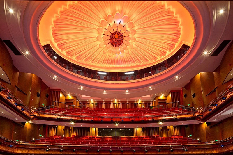 在室內設計上,采用了“風格性修復”的思路:正門大廳的大理石地坪上鑲嵌著半幅太陽花三星圖案,與建筑雙塔正立面圖案上下呼應,暗示著“中國大戲院”前身作為“三星大舞臺”的歷史文脈;各樓層休息廳的天花造型也延續了歷史遺存的天花風格,營造著歐式古典的空間感;而最為美倫美奐的當屬劇場觀眾廳穹頂,中心錯落有致的兩層共32瓣花瓣組成了一朵盛開的蓮花,在燈光的烘托下,高浮雕蓮花紋光影透疊,層次分明而又工整細膩,無處不彰顯這座富有歷史底蘊的劇院魅力。