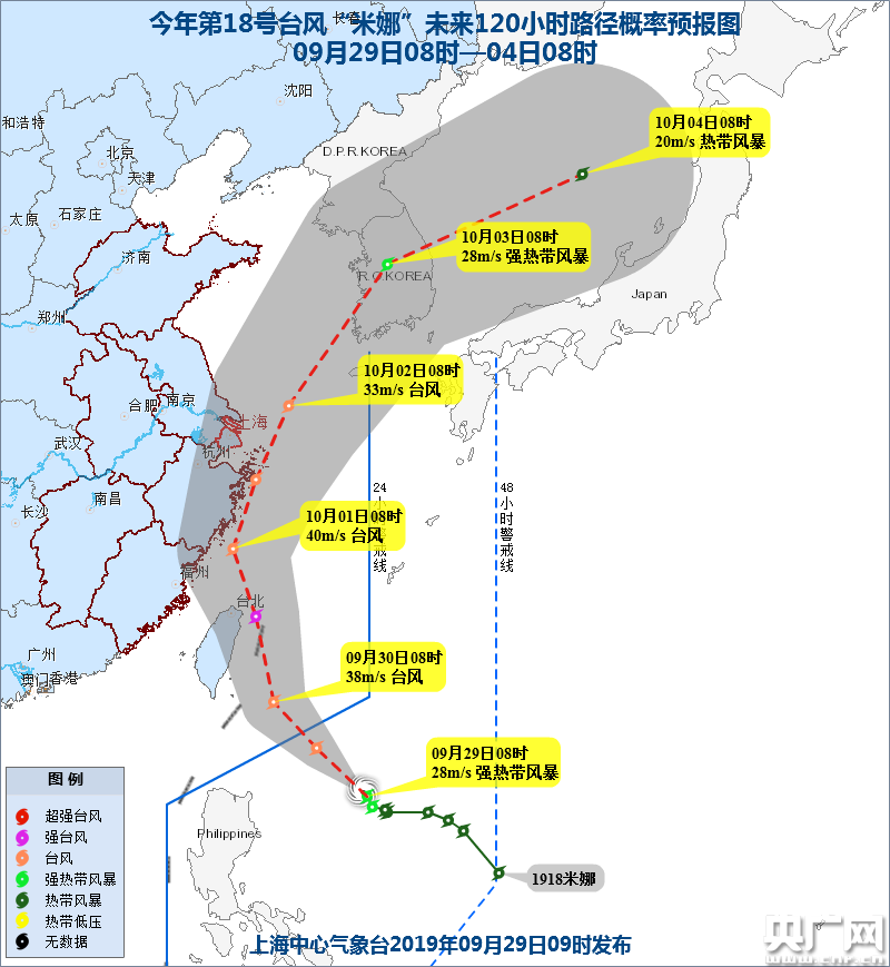 上海中心氣象臺今天09時發布臺風“米娜”預計路徑圖(央廣網發 上海中心氣象臺供圖)