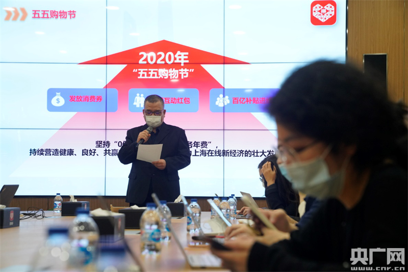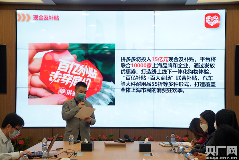 4月23日,拼多多宣布,將投入15億元現金及補貼,聯合10000家上海品牌和企業,全力支持上海市“五五購物節”。拼多多高級副總裁王堅正在介紹平臺助力“五五購物節”的具體舉措。(本文圖片:央廣網發 李勝 攝)