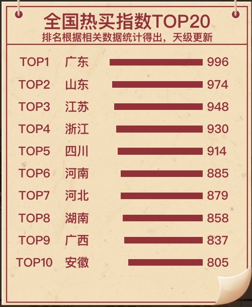 ▲榜單顯示,在支持國貨這件事上,廣東、山東、江蘇、浙江、四川等地的消費者“毫不手軟”。