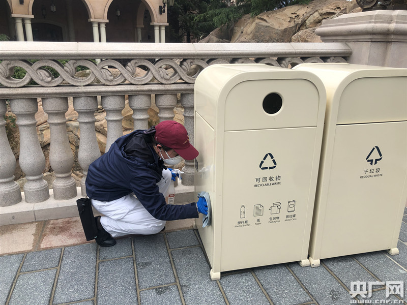 迪士尼樂園的演職人員在進行清潔工作(央廣記者楊靜 攝)