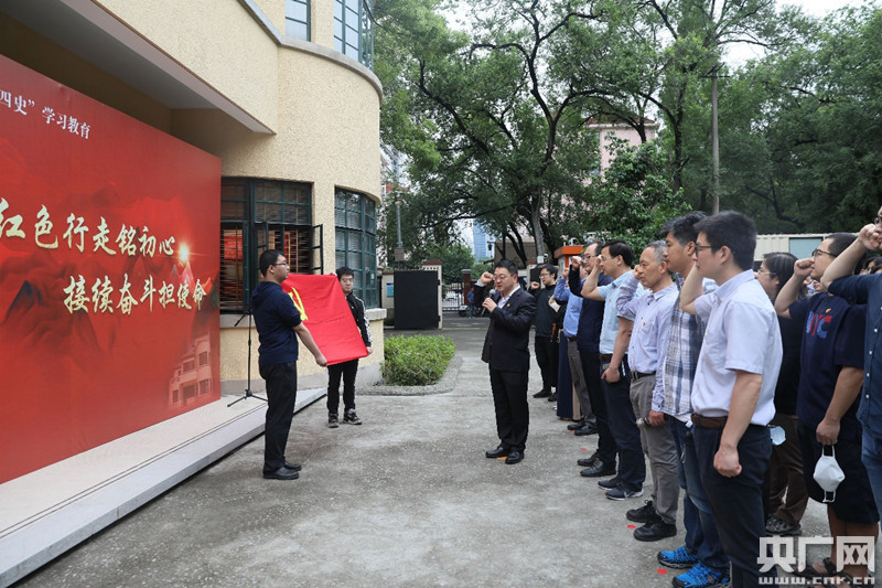 本次紅色行走的起點位于國福路51號的一棟三層小樓,這里曾是《共產黨宣言》中文全譯本首譯者陳望道老校長的寓所,后辟建為《共產黨宣言》展示館。在校黨委副書記、副校長周亞明的帶領下,來自物理學系黨委、生命學院生物化學與分子生物學系教工黨支部、信息學院電子工程系教師黨支部、管理學院信息管理與信息系統系黨支部的60余名黨員代表在《共產黨宣言》展示館前重溫入黨誓詞。