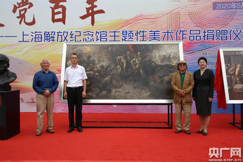 今年也是改陳后的上海解放紀(jì)念館重新開放一周年。在上海解放紀(jì)念館改陳過程中,上海海上油畫雕塑創(chuàng)作中心應(yīng)邀組織了多名優(yōu)秀藝術(shù)家圍繞上海解放革命史創(chuàng)作了六件美術(shù)作品,包括國畫《五前委》、雕像《胡文杰烈士》、浮雕《保衛(wèi)大上海》、油畫《寶山之戰(zhàn)》《郵電大樓之戰(zhàn)》《金融之戰(zhàn)》,現(xiàn)捐贈給上海解放紀(jì)念館陳展并永久收藏。市文聯(lián)、市美協(xié)、長三角優(yōu)秀藝術(shù)家出席捐贈儀式。