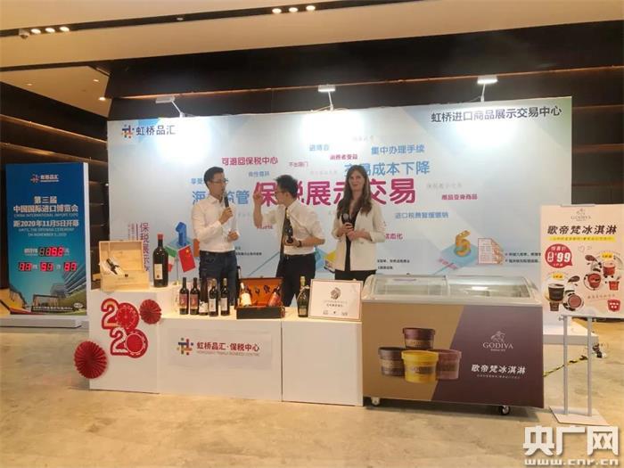 在一街之隔的虹橋品匯線下直播間,主持人已經品嘗到保稅倉同款Godiva冰激凌,現場銷售價格是99元6盒。意大利姑娘向主持人介紹各種葡萄酒。進博會展商華飲公司的圣蝶白葡萄酒去年進博會后銷售在虹橋品匯銷售1.5萬瓶。此次疫情后第一批清關貨物第二天就在虹橋品匯上架銷售,55購物節期間售價是89元一瓶,電商平臺的售價是398元。據悉,虹橋品匯為進博展商提供“兩免兩統一”的便利(免除場地租金、免入場保證金、提供統一裝修和道具、提供統一導購和收銀),及保稅倉半年的免租政策,使得進博展商便利入駐,消費者得實惠。