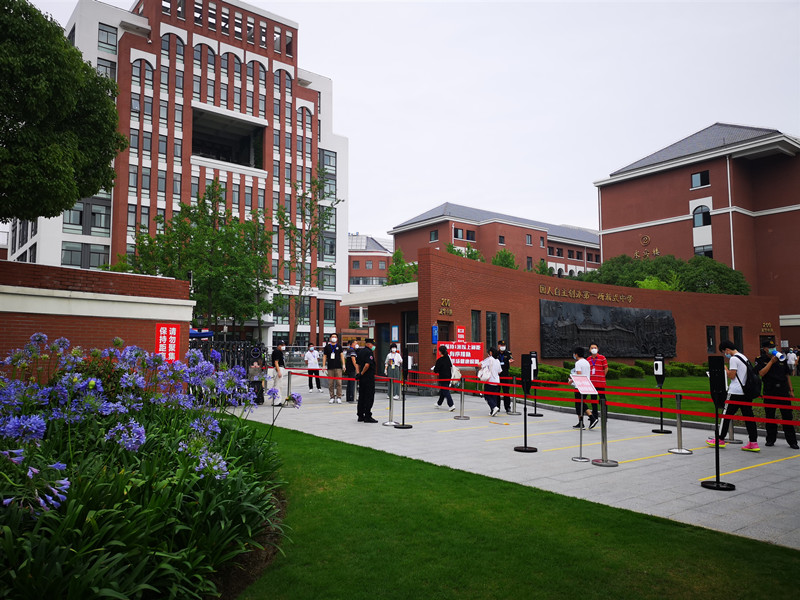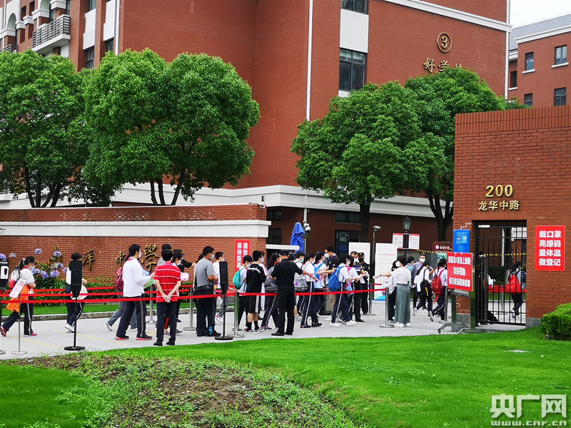 記者在位于上海市徐匯區(qū)的南洋中學(xué)考點看到,學(xué)校大門所在的龍華中路也是進行了交通管制,馬路邊作為家長的臨時停車場。根據(jù)上海市教育考試院的建議,希望考生能提前45分鐘就到達現(xiàn)場。剛才八點鐘左右,考生已經(jīng)開始陸續(xù)進場。現(xiàn)場的考生、老師和家長們也基本上都戴著口罩,校門口還準備了免洗洗手液,并要求考生保持一米以上間距排隊測溫入場。
