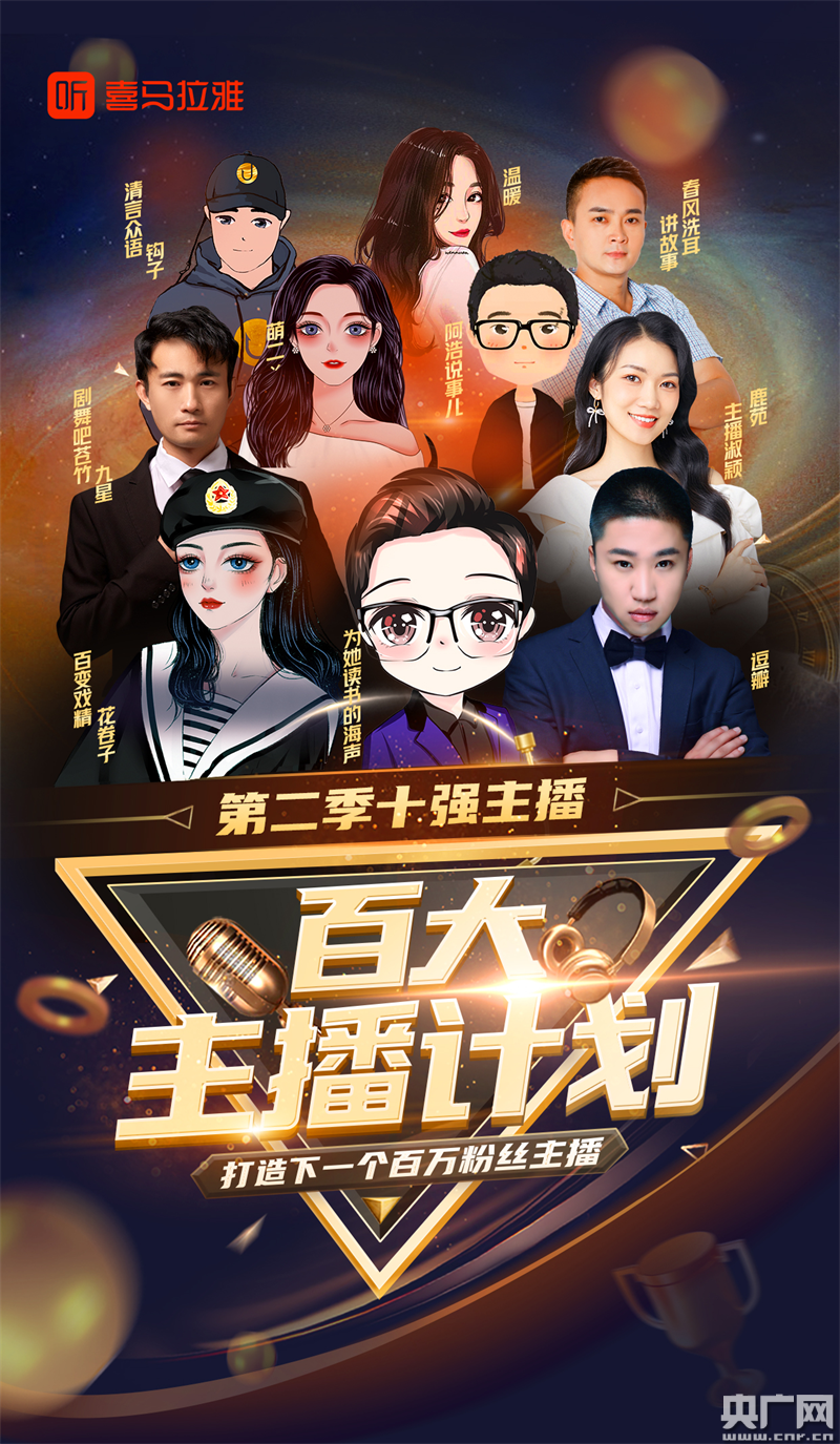 “百大主播計劃”由喜馬拉雅直播于2020年9月發起,為期一年,將通過尋找100種獨特的聲音,造血100名潛力主播,組成“百大主播”強大陣營,進一步賦能平臺主播出圈與商業變現,打造優質多元的內容生態。第一季10強主播在喜馬拉雅“直播+錄播”一體化策略的扶持下,用戶收聽數據較扶持前已翻倍。第二季比賽以“以聲繪世界”為主題,持續面向全網征集優質好聲音,尋找人氣與實力并存的聲音偶像。