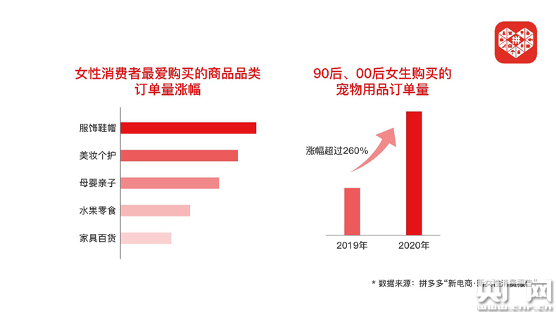 報(bào)告顯示,2020年,女性消費(fèi)者在拼多多平臺購買頻次最高的產(chǎn)品品類依次是服飾鞋帽、美妝個(gè)護(hù)、母嬰親子、水果零食和家居百貨。其中,女性購以自用的女裝、美妝等產(chǎn)品訂單量增幅明顯高于其他家庭公用類產(chǎn)品,“悅己消費(fèi)”趨勢明顯。