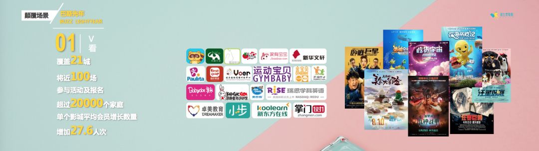 比如巴斯光年計(jì)劃的V看活動(dòng),針對(duì)有小孩的家庭,合作的品牌有運(yùn)動(dòng)寶貝、新東方、卓美教育等,發(fā)起半年內(nèi)已經(jīng)舉辦將近100場(chǎng),有超20000個(gè)家庭報(bào)名,單個(gè)影城平均會(huì)員增長數(shù)量27.6人。