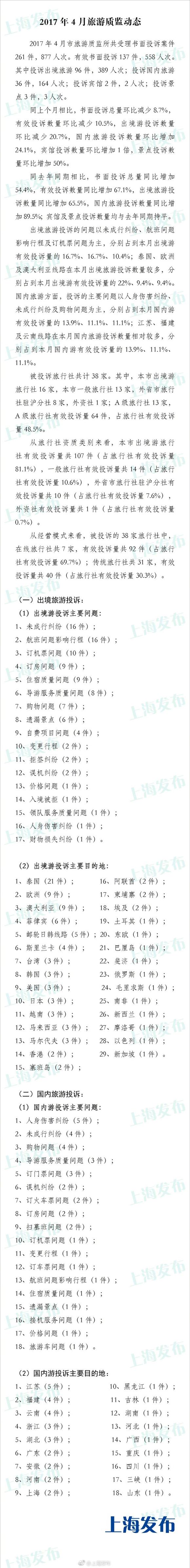 據(jù)上海發(fā)布,公布2017年4月旅游質(zhì)監(jiān)簡況:出境游中,泰國、歐洲、澳大利亞旅游線路遭投訴較多,投訴問題以未成行糾紛、航班問題影響行程、訂機(jī)票問題為主;國內(nèi)游中,江蘇、福建、云南線路遭投訴較多,涉及人身傷害糾紛、未成行糾紛、購物等問題。