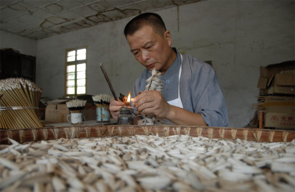 來自安徽涇縣的宣筆制作技藝吸引了不少游客。作為這一國家級非遺的傳承人,佘征軍介紹,自家世代制筆,到他這里已是第六代。目前有十幾個年輕人跟自己學藝,而自己也曾走入校園,向中小學生普及宣筆的制作方法!皣覍鹘y文化的重視讓我們感覺到時代賦予的機會,我們一定要牢牢把握,把宣筆制作技藝發揚光大!辟苷鹘榻B,宣筆制作技藝源于秦代,盛于唐宋,迄今已有2000多年的歷史。以選毫精良、制作精密而著稱,具有裝潢雅致、毛純耐用、剛柔適中、尖圓齊健四德之美的獨特風格。宣筆制作全為手工制作,以前大多是書畫藝術家們定制,或售往朵云軒等,現在借助互聯網,宣筆已經可以網上購買!皶ㄊ侵腥A民族精神和文化的表達,在最簡約的層面上濃縮了中華文化的基本精神。因此,一支好的毛筆一直都是書法愛好者的追求。”