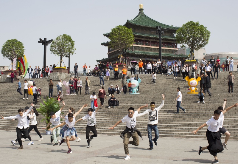 團員青年們5月4日下午在鐘鼓樓下沉廣場以“快閃”的方式慶祝五四青年節。西安晚報首席記者王健 攝