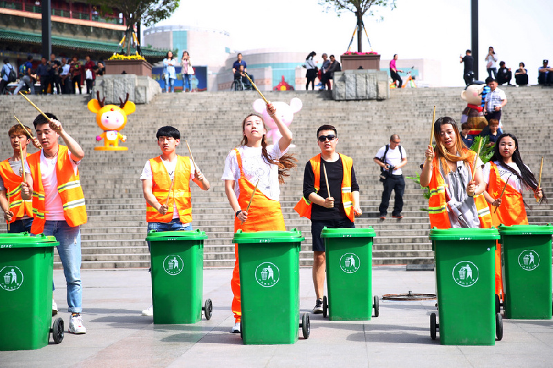 西安新聞網訊(文記者張松)鐘樓金花廣場今日行人如織。突然,十個綠色的垃圾桶被搬進了廣場。圍觀的群眾正在納悶把垃圾桶搬進廣場干什么?這時,十名身穿黃色保潔衣服的青年男女,用木棍在垃圾桶上敲打起來,奏響了美妙的樂章。