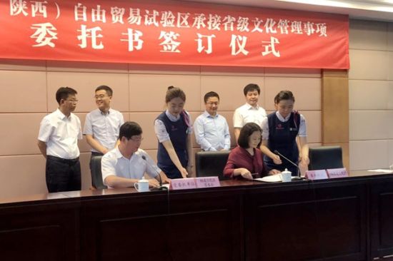 圖為陜西省文化廳舉行中國(陜西)自貿(mào)區(qū)承接省級文化管理事項委托書集中簽訂儀式。