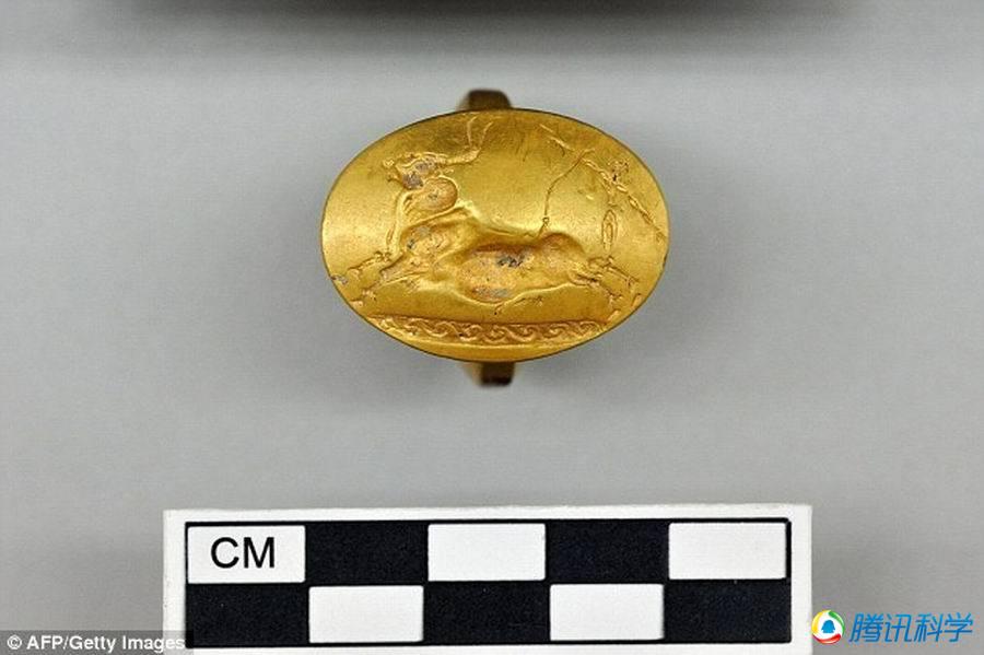 目前,考古學(xué)家在希臘境內(nèi)挖掘發(fā)現(xiàn)一具3500年前古代戰(zhàn)士墳?zāi)梗l(fā)現(xiàn)的大量珍寶有助于揭曉古希臘文明的起源。考古學(xué)家共挖掘發(fā)現(xiàn)4枚戒指,圖中是一枚金戒指,圖案顯示一只跳躍的公牛,這是古希臘克里特文明中一種最普通的圖案主題。(騰訊科學(xué)訊悠悠/編譯)