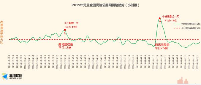 從擁堵時(shí)間來(lái)看,全國(guó)高速出程擁堵主要出現(xiàn)在小長(zhǎng)假前一天傍晚,即2018年12月29日17點(diǎn)-19點(diǎn),擁堵里程為平日1.5倍,返程1月1日15點(diǎn)-20點(diǎn)擁堵程度較高,峰值出現(xiàn)在17點(diǎn)-18點(diǎn),擁堵里程為平日2.5倍。