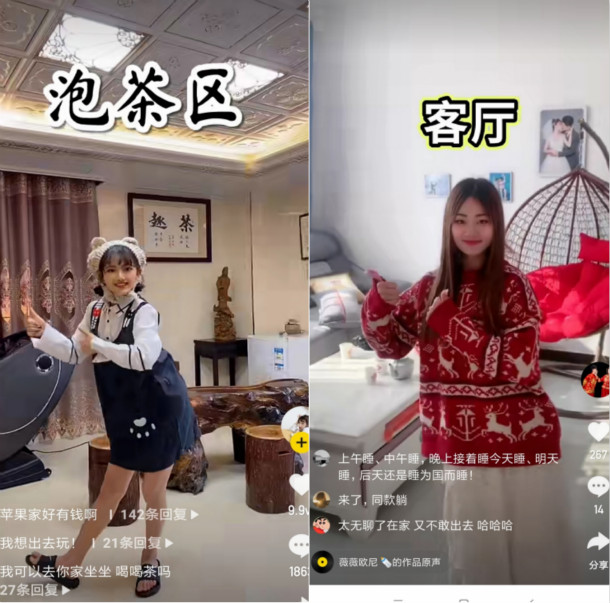 用戶“蘋果妹”( ID:pgm55400)是一個擁有303.7萬粉絲的快手大v,她給網(wǎng)友們分享了自己“如何在家一日游”:早上醒來,穿上精致可愛的衣服,客廳游、泡茶區(qū)游、種植區(qū)游、陽臺游、餐廳游、廚房、WC游,最后筋疲力盡回到床上。她的分享收獲了9.9萬人次點贊,近2000個留言。