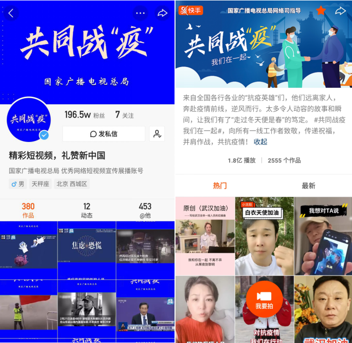 疫情當前,多一份對疫情的了解,就會多一份安全保障。2019年9月,廣電總局在快手開通了優秀網絡短視頻宣傳展播賬號,目前粉絲達196萬。快手在打好自身的疫情防控狙擊戰的同時,主動承擔社會責任,在廣電總局的統籌下,開展了“共同戰‘疫’”視頻宣傳活動,重點資源位突出推薦,積極發揮快手平臺的流量、技術和資金優勢,全力傳播全國人民守望互助的正能量內容,及時傳遞疫情的準確信息,普及科學防護權威信息,累計發布疫情防控短視頻200余條,播放量近5億次。