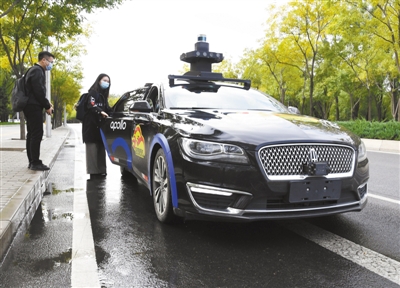 市民在北京市海淀區(qū)稻香湖路的百度自動駕駛出租車指定上車點(diǎn)乘車。新華社記者 任超攝