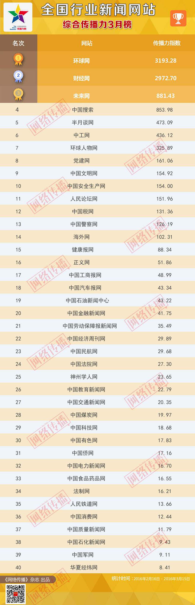 中央網信辦《網絡傳播》雜志傾力打造的“全國行業新聞網站傳播力2016年3月榜”今日正式發布。