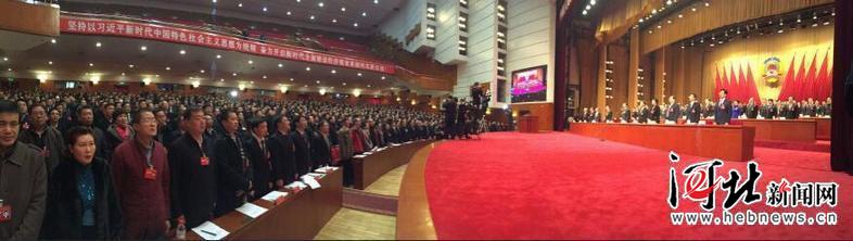 1月24日上午9時,政協河北省第十二屆委員會第一次會議在省會河北會堂開幕,圖為全場起立唱國歌。 記者霍艷恩 孟宇光攝