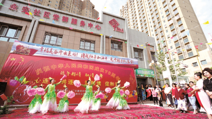 6月3日,在新疆巴音郭楞蒙古自治州庫爾勒市團(tuán)結(jié)街道永安社區(qū),天山雪蓮藝術(shù)團(tuán)演員在表演舞蹈《共筑中國夢》。當(dāng)日,該社區(qū)聯(lián)合中國電信巴州分公司開展“心連心、共逐夢、筑融情、促和諧”聯(lián)誼活動,大家歡聚一堂,一起包粽子,賞歌舞,喜迎中國傳統(tǒng)節(jié)日端午節(jié)。