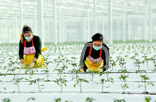 10月17日,溫宿縣依希來木其鄉(xiāng)闊依其村村民在溫宿國家農(nóng)業(yè)科技園區(qū)智能溫室高效示范建設(shè)項目點務(wù)工。作為溫宿縣招商引資項目,該項目吸納當?shù)?0余人就業(yè),其中貧困戶15人。