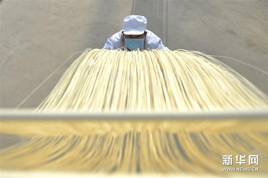 12月11日,在河北省臨西縣東尖冢村,省級非遺傳承人王敬達在制作手工掛面。 手工掛面是河北省臨西縣的傳統地方特產,這種面條潔白中空、入鍋即熟、滑柔爽口。手工掛面經過和面、軋、切、搓、盤、拉、掛桿等多道工序手工制作而成。2009年,臨西手工掛面制作技藝被列入河北省非物質文化遺產名錄。